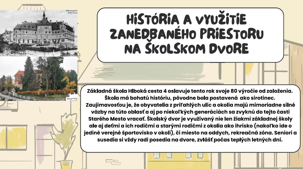 Cieľom projektu je revitalizácia centrálnej časti školského dvora ZŠ na Hlbokej ceste ako možnosti vytvorenia kultivovaného a estetického prostredia verejného priestoru, ktoré by slúžilo nielen pre potreby edukácie žiakov, ale predstavovalo by aj miesto komunitného stretávania sa či oddychu a relaxácie.